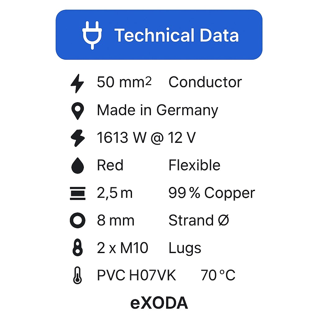 - Batteriekabel mit einem Querschnitt von 50 mm², gefertigt in Deutschland, eignet sich für max. 1613 Watt bei 12V.